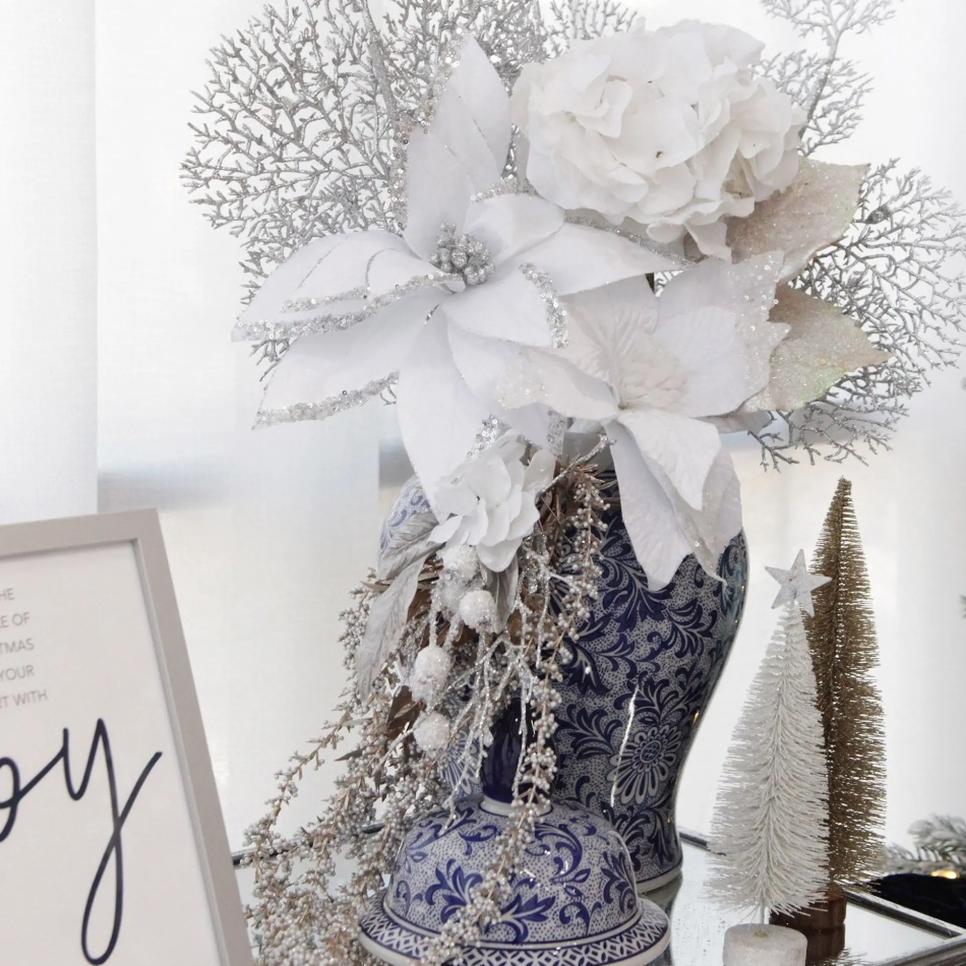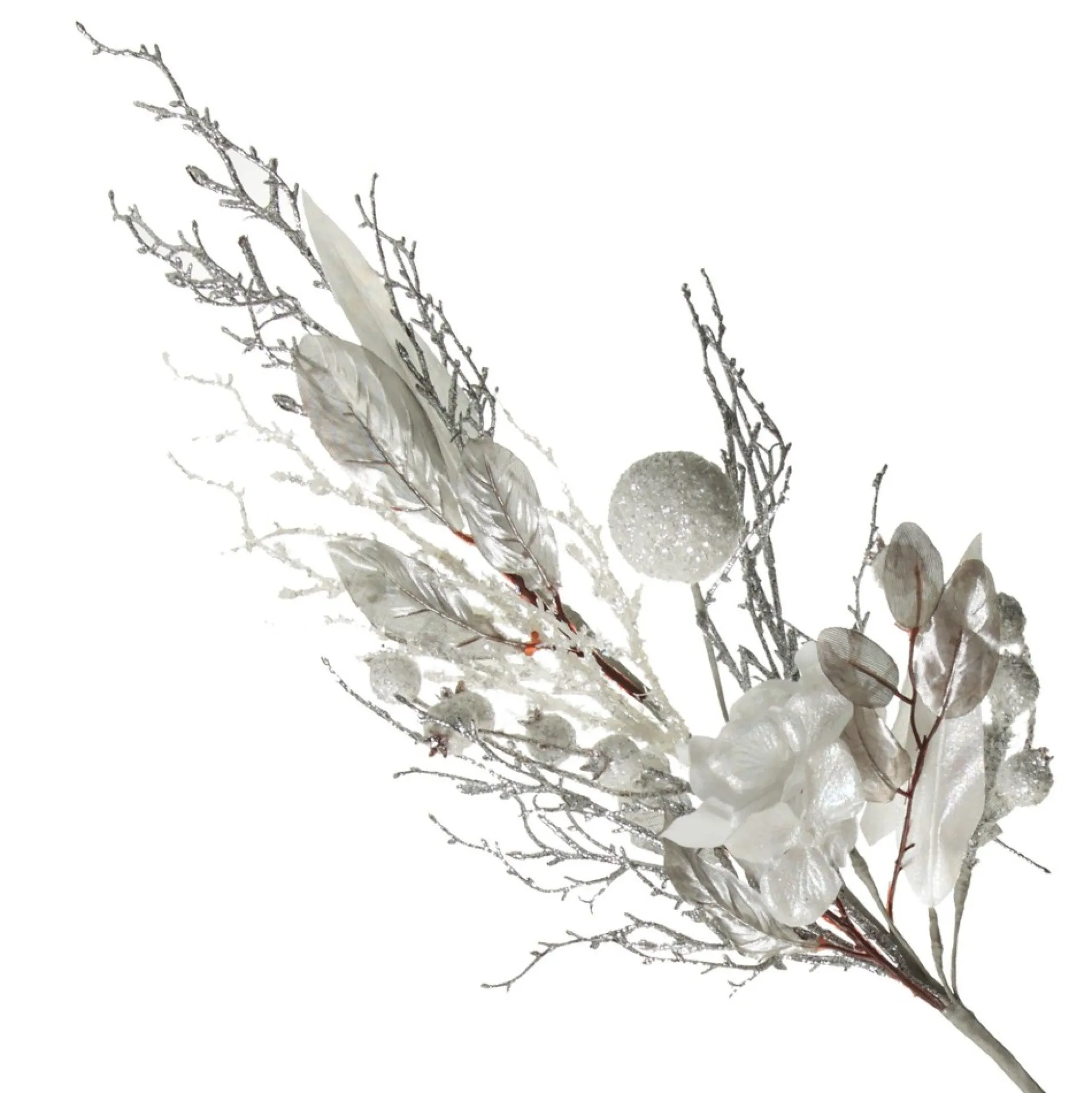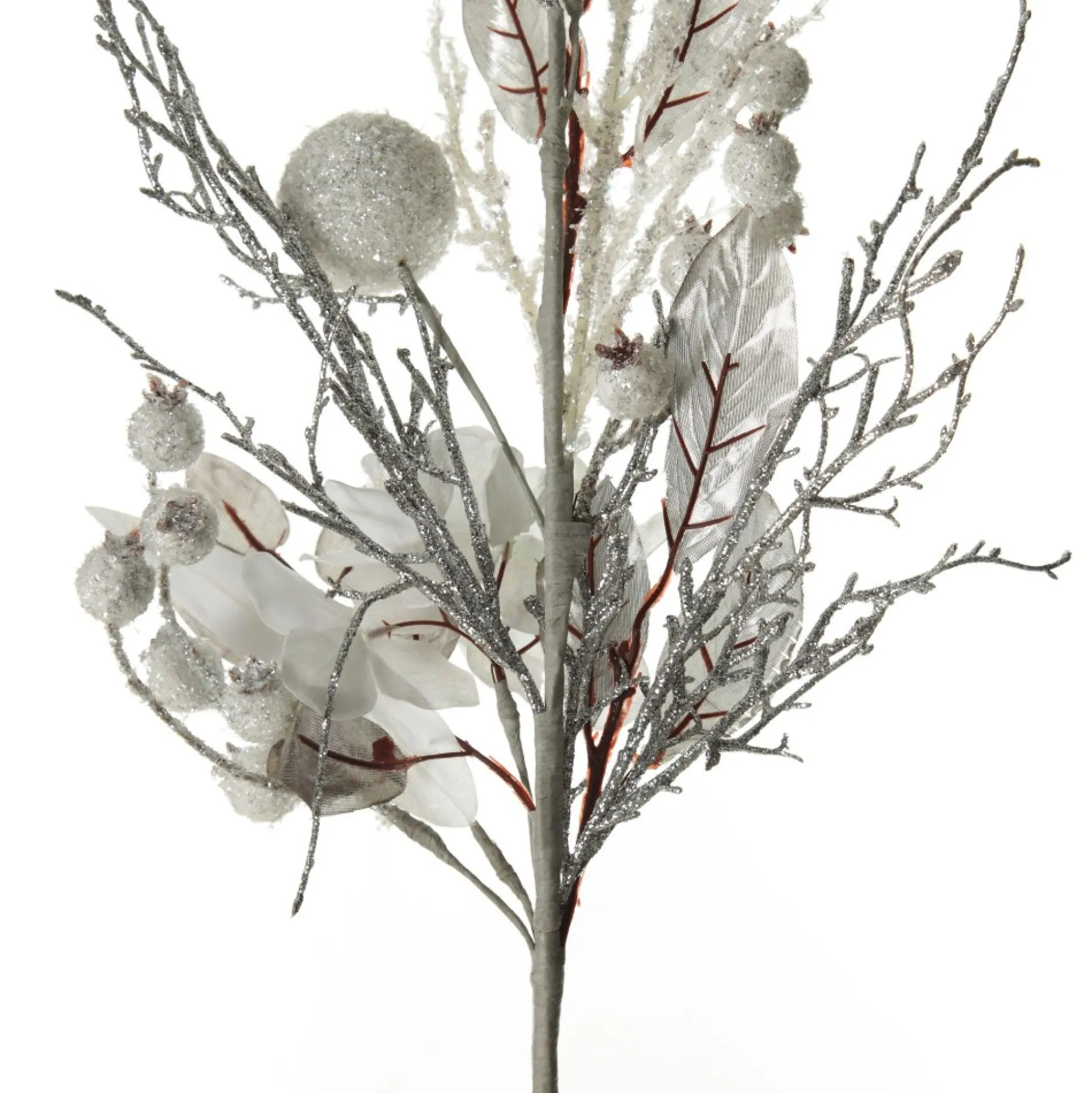 Crafted With A Durable And Flexible Stem, This Spray Features A Collection Of Stunning White And Silver Flowers, Leaves, Twigs, And Berries In A Range Of Glitter, Foil And Metallic Finishes. The Lush Foliage And Mixed Finishes Create A Truly Unique Spray That Sparkles Beautifully.