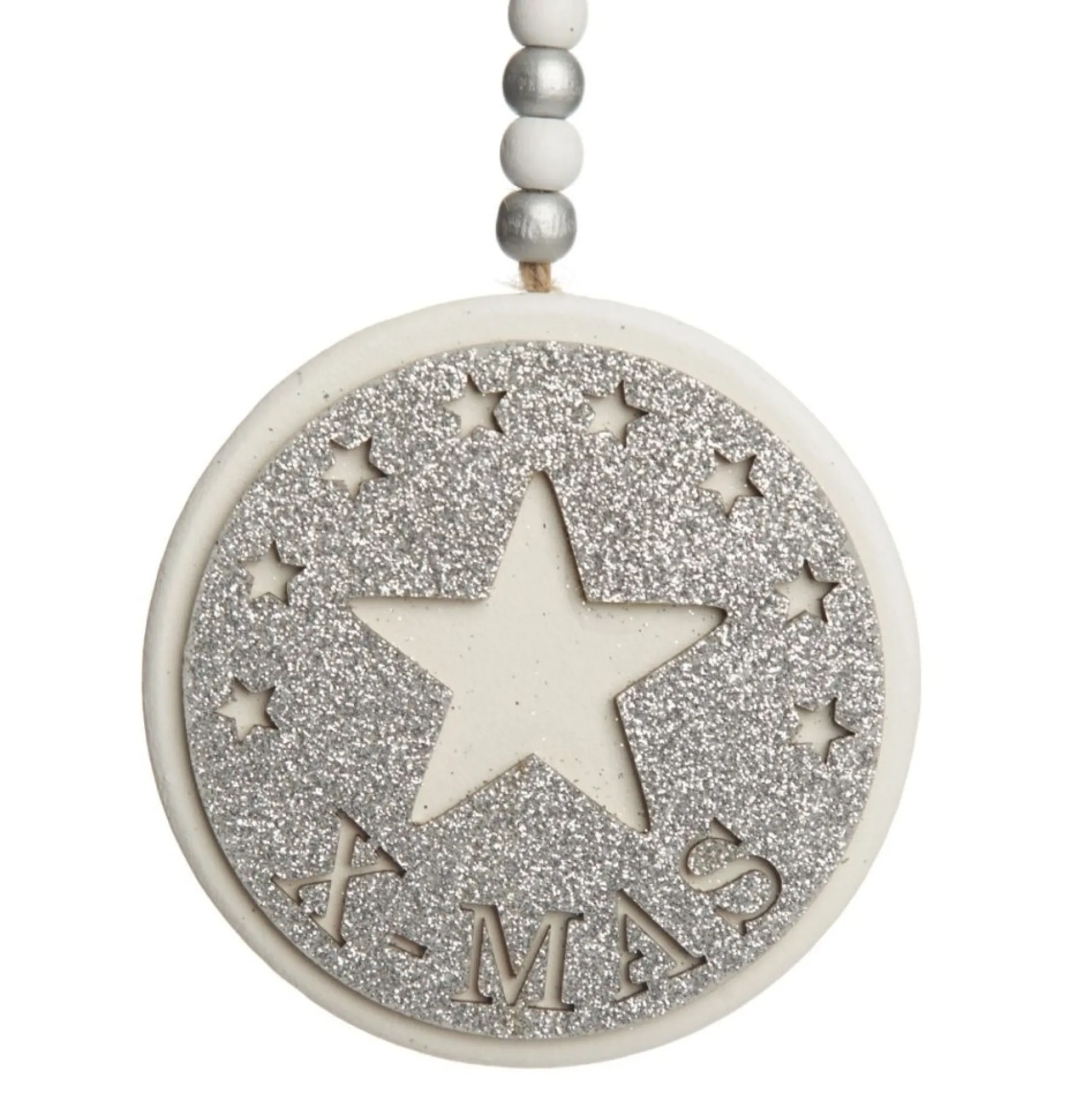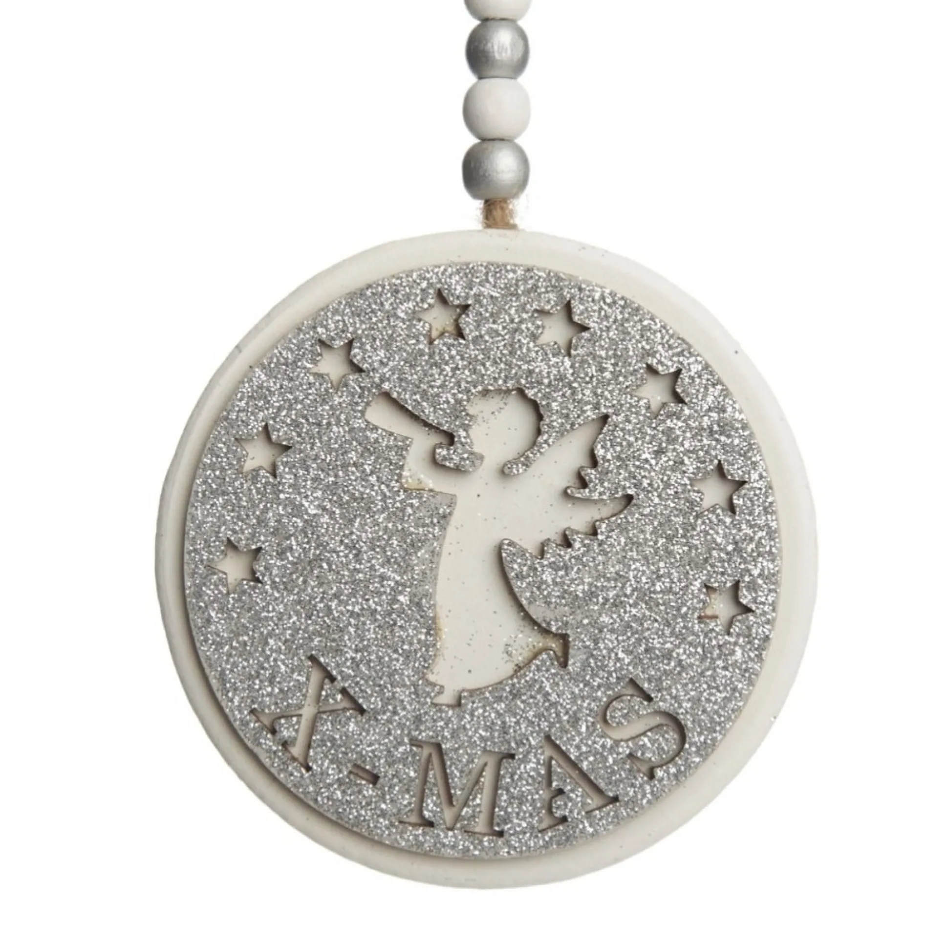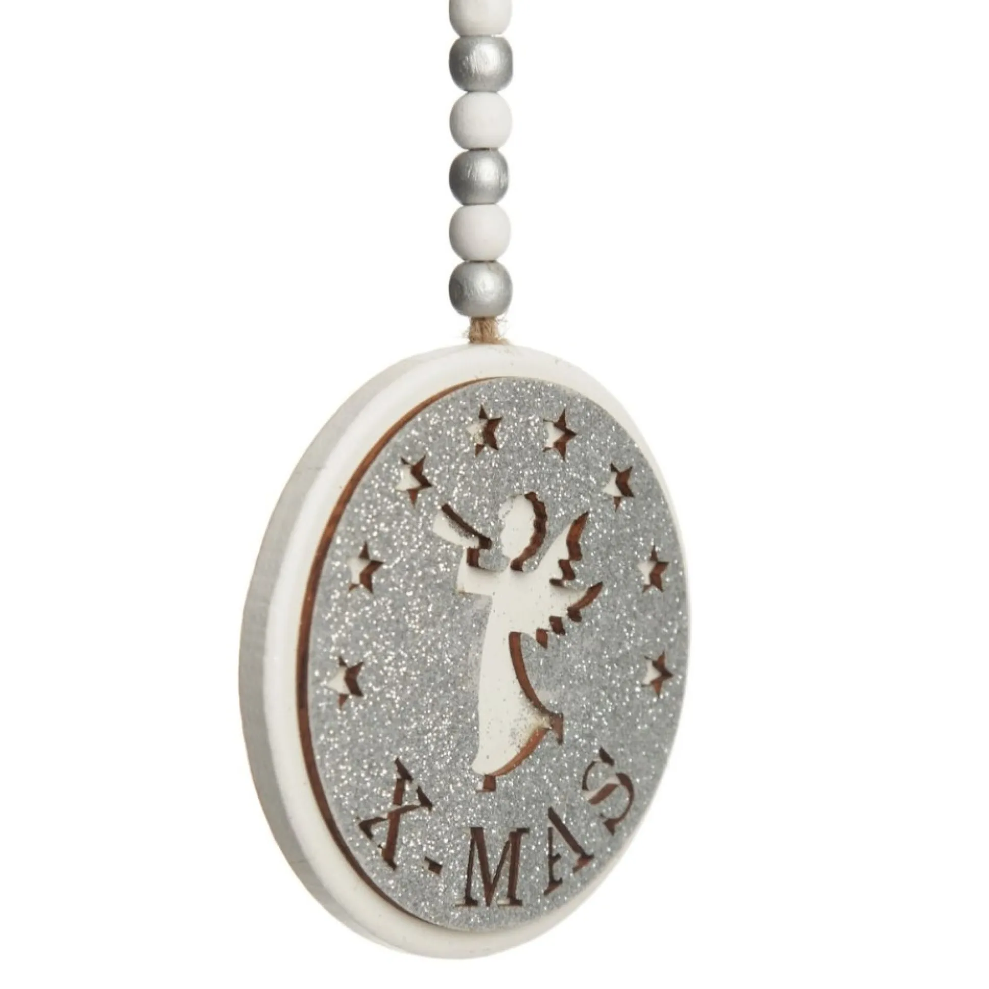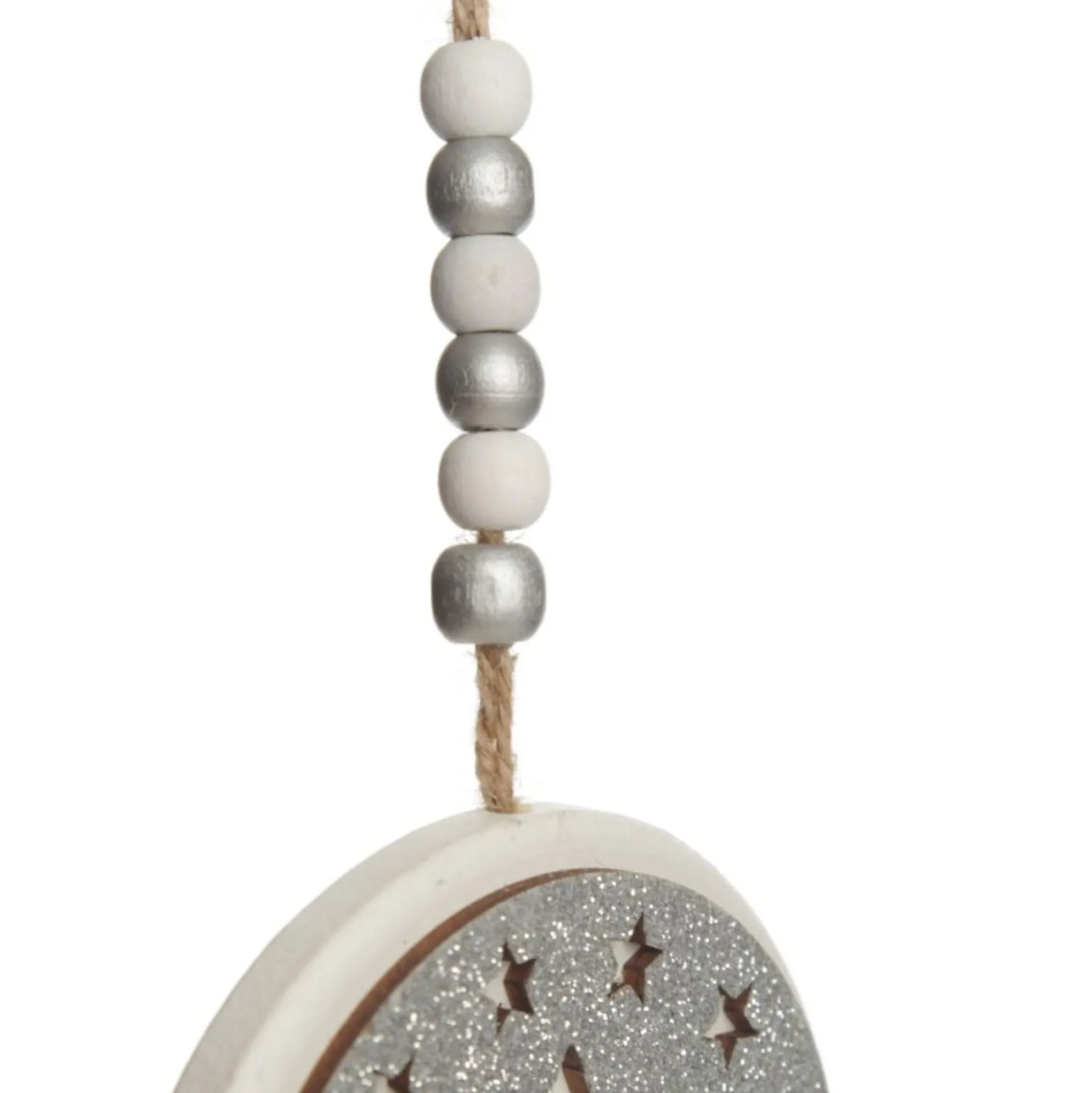 These Silver Glitter Wooden Hanging Decorations With Christmas Cut Outs Will Make A Beautiful Addition To Any Style Of Christmas Tree. Made From Wood And Finished With A Jute String And Wooden Beads, Each Decoration Measure At 10Cm In Diamter, With A Total Hanging Length Of 27Cm.