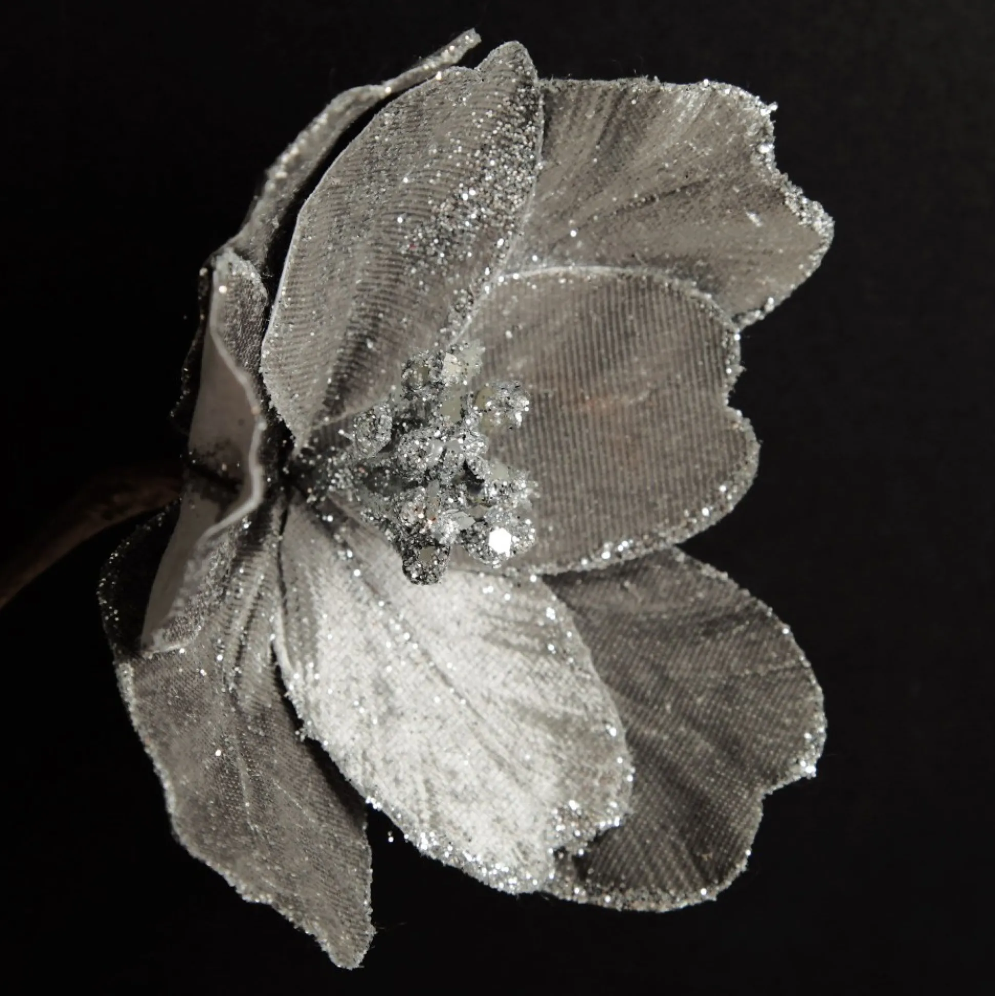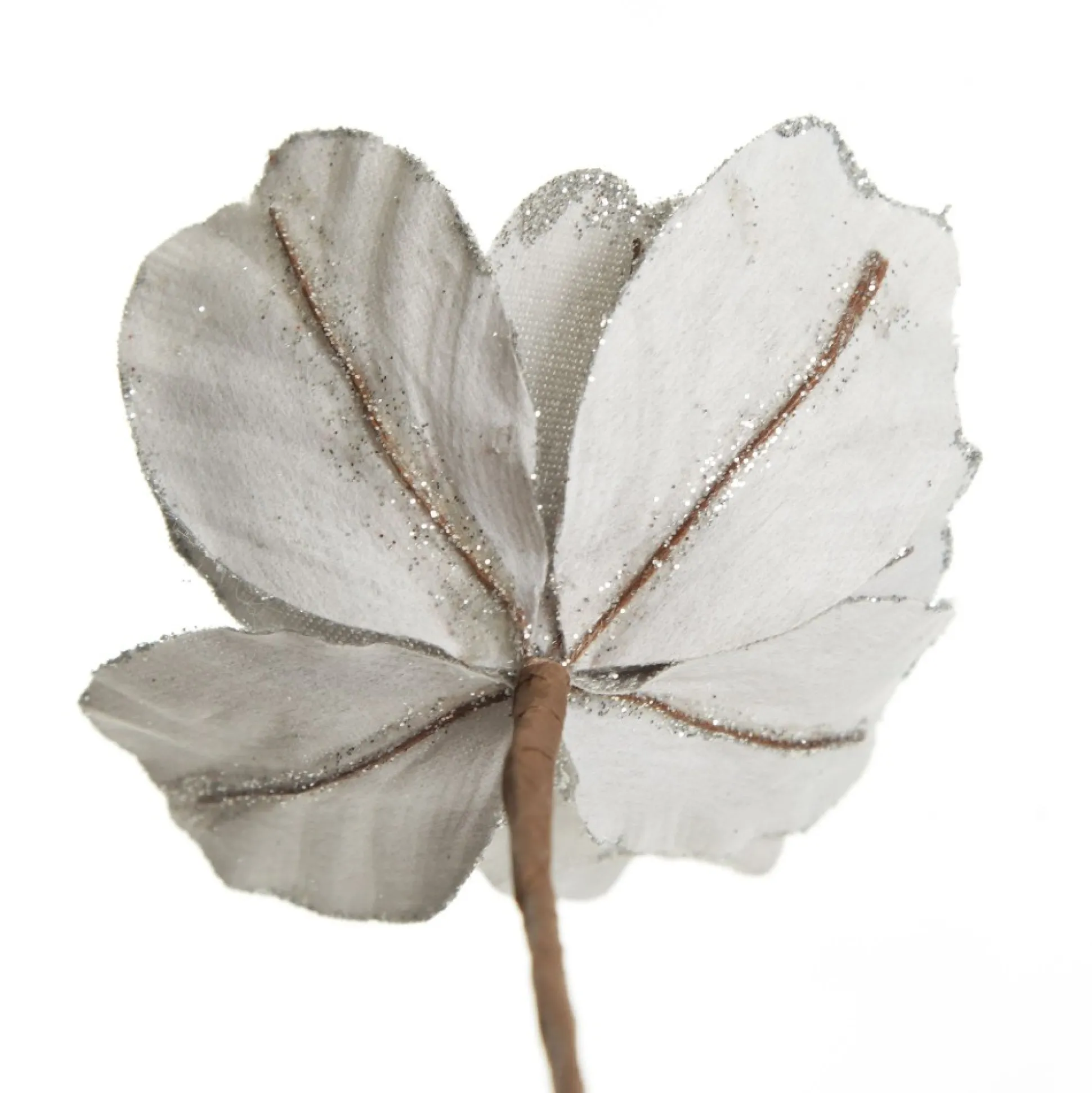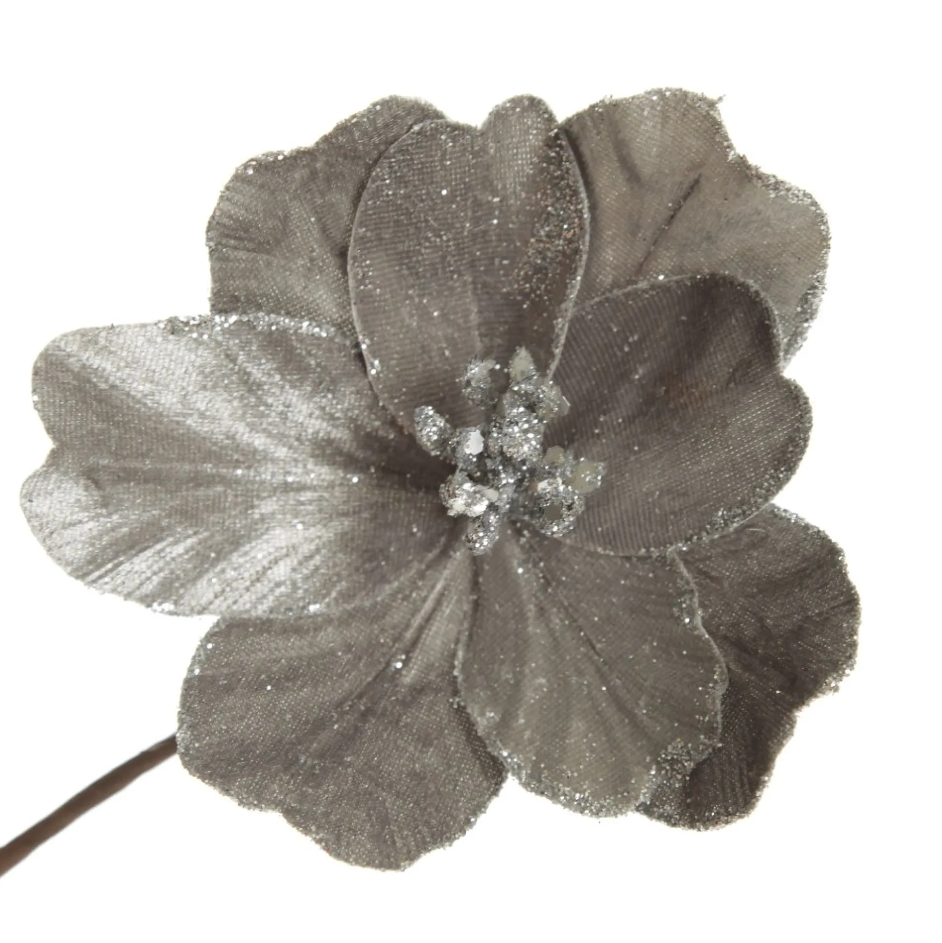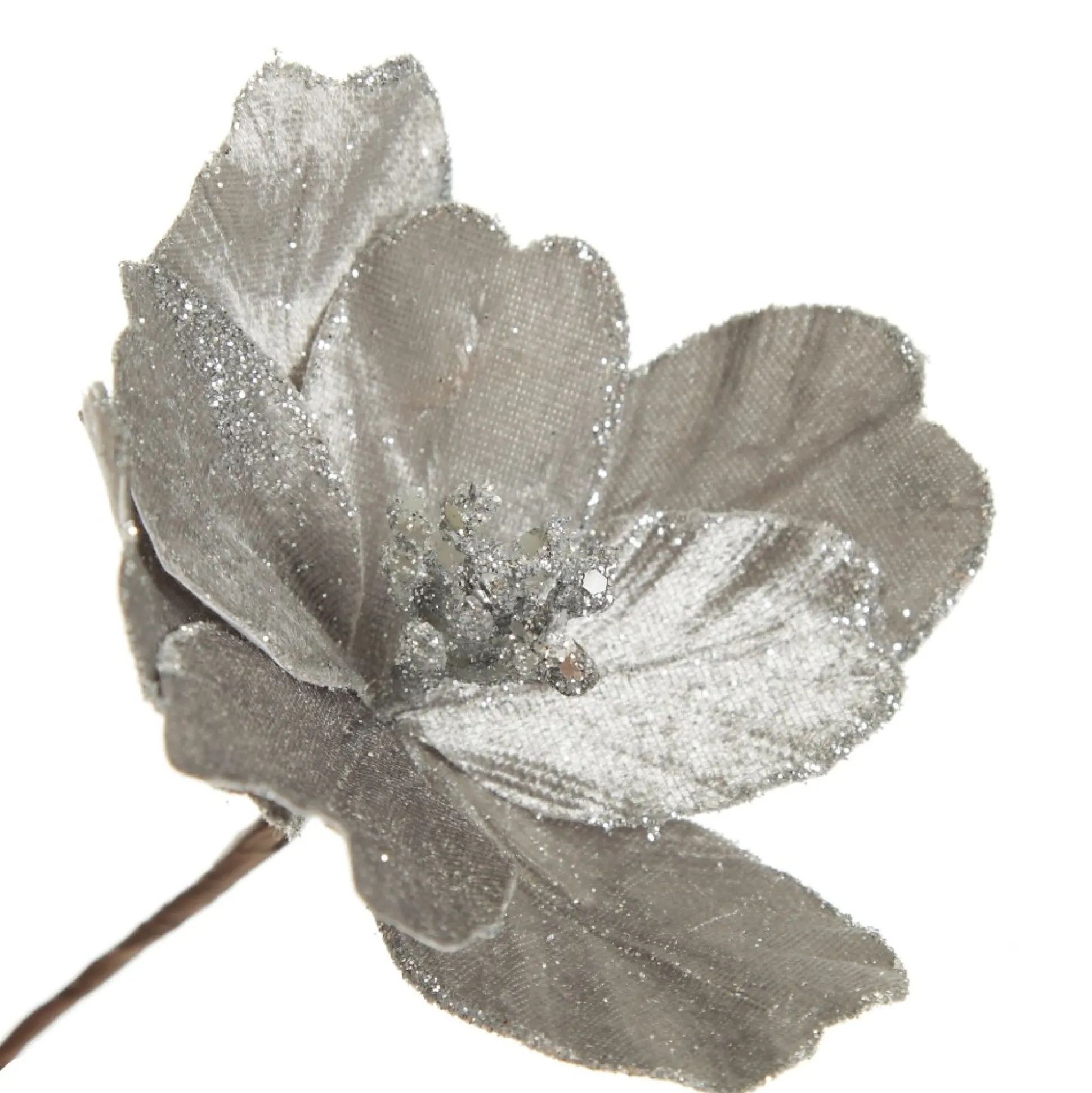 Silver Satin Magnolia Flower Stem with Glitter Trim Christmas Flowers|