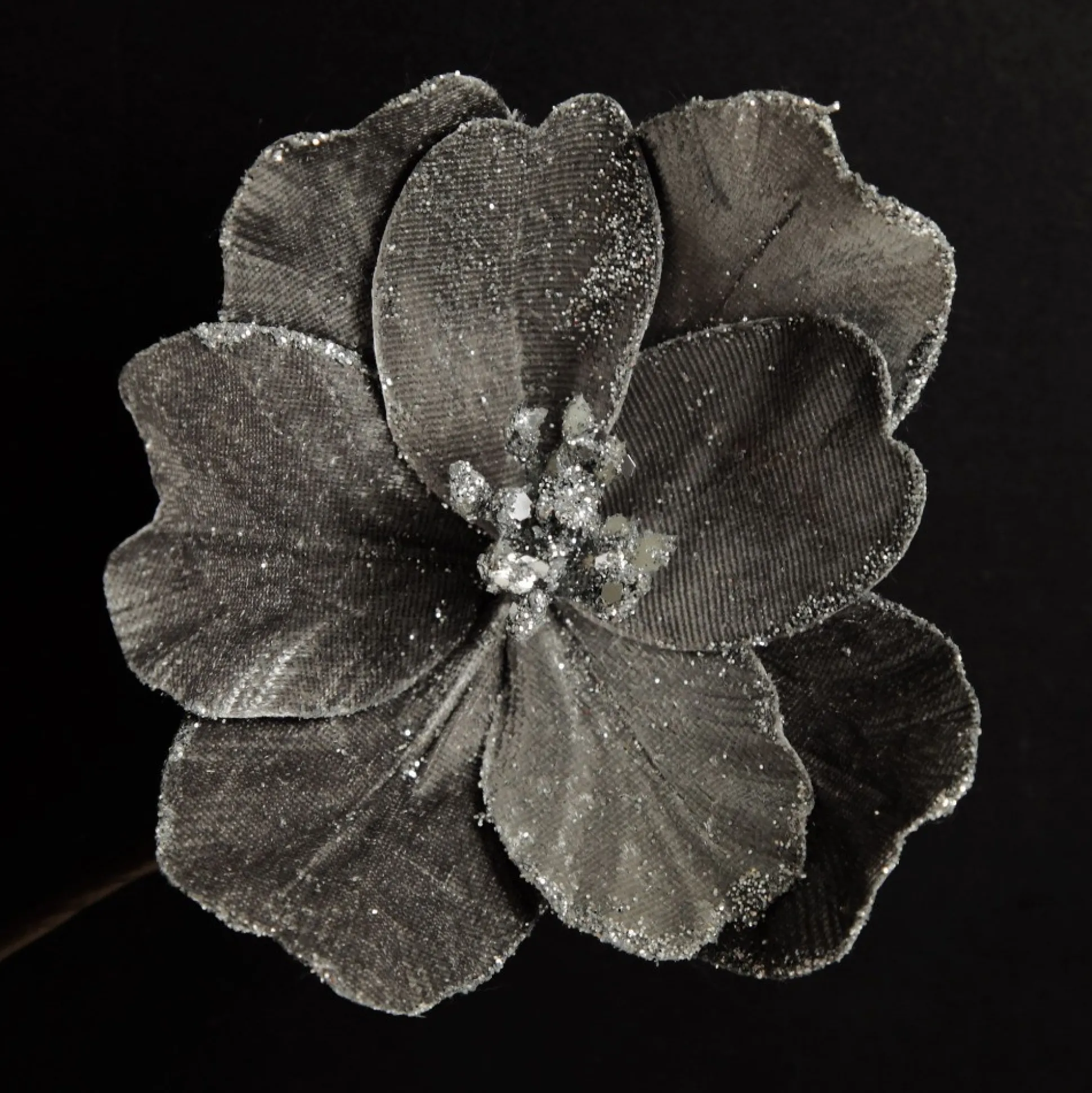 This Sleek Silver Magnolia Flower Features Satin Petals With Silver Glitter Trim And Pollen Details. A Short Stem Extends From The Base For Easy Placement And Use.