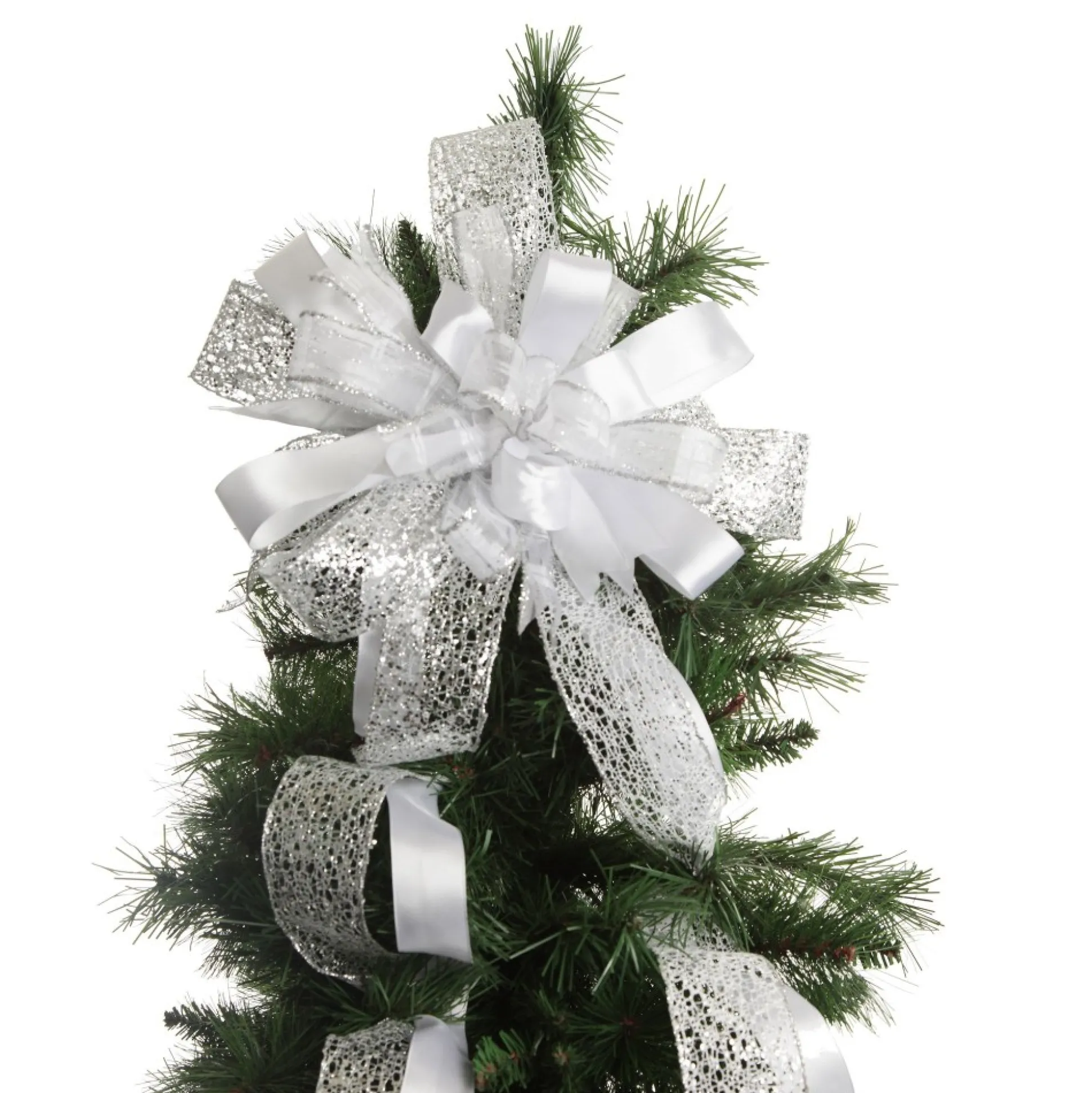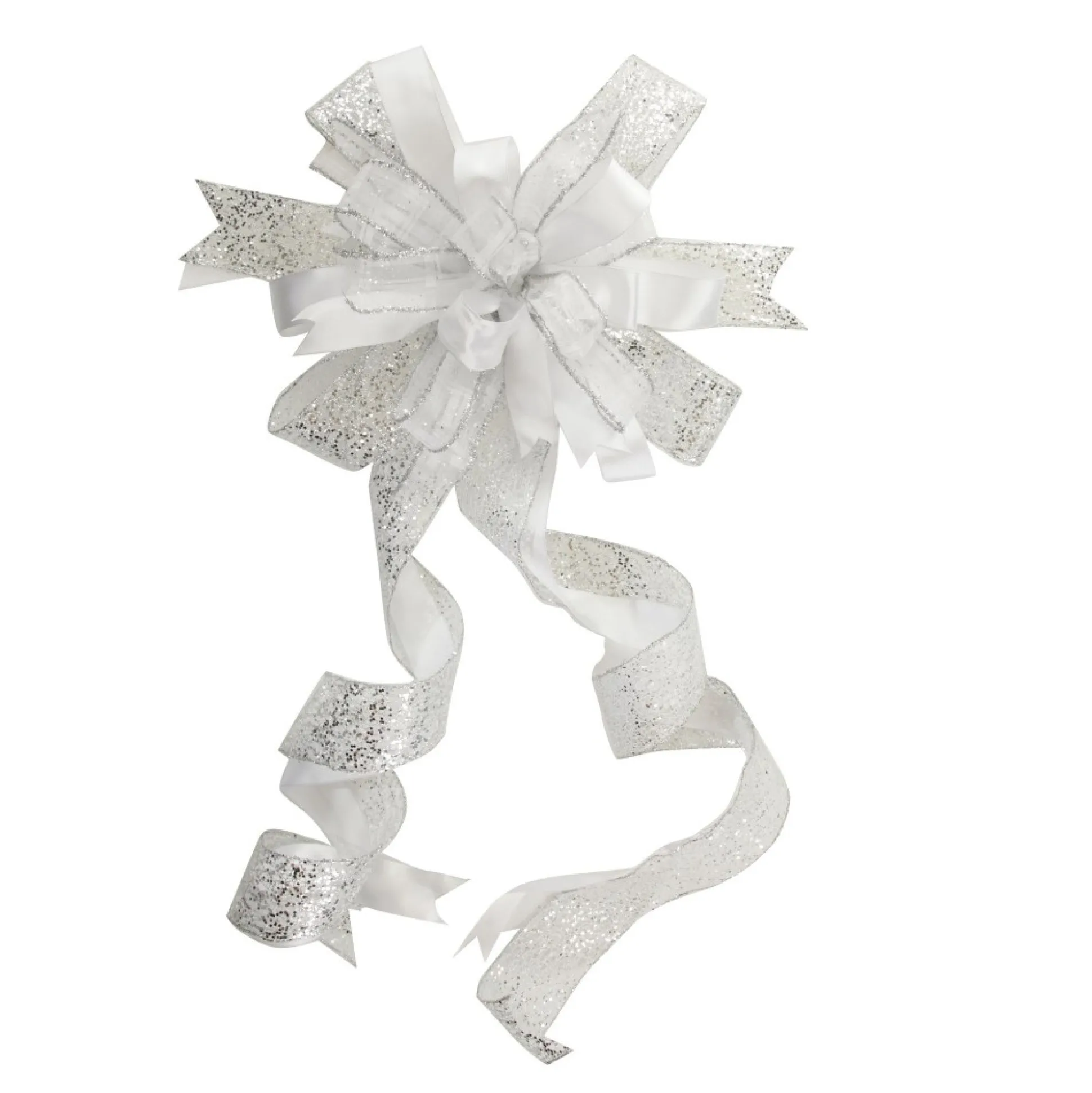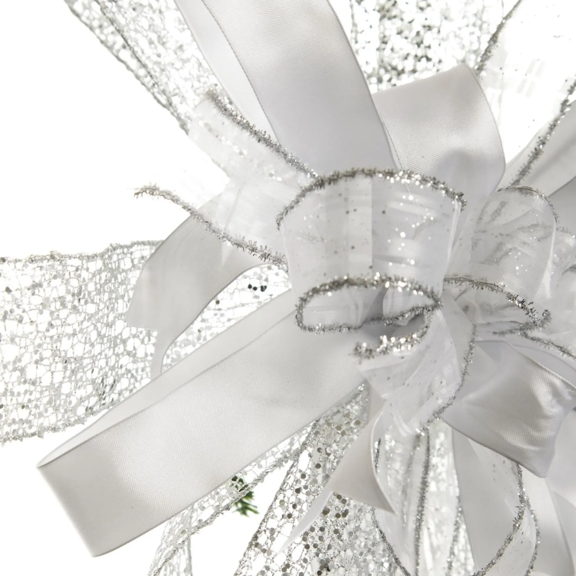 Add Elegance To Your Festive Display With Our White And Silver Glitter Deluxe Tree Topper Bow With Streamers. Featuring A Combination Of 3 Ribbons – Silver Glitter Mesh, White Satin, And Sheer White Plaid With Silver Trim – Hand Crafted Into Intricate Layered Loops Creating A Lush Arrangement. Ribbon ‘streamers’ Hang Down For Added Texture. You Can Use This Unique Bow To Embellish Your Christmas Tree As A Tree Topper, To Decorate A Large Custom Wreath, Or To Decorate Any Door, Wall, Or Window In Your Home. Each Ribbon Is Wired Making It Easy To Place And Arrange When Decorating. Please Note That The Bow Will Arrive Slightly ‘squished’ For Packaging And Shipping Purposes However Due To The Wired Nature Of The Ribbon It Is Easy To Reshape When Decorating.