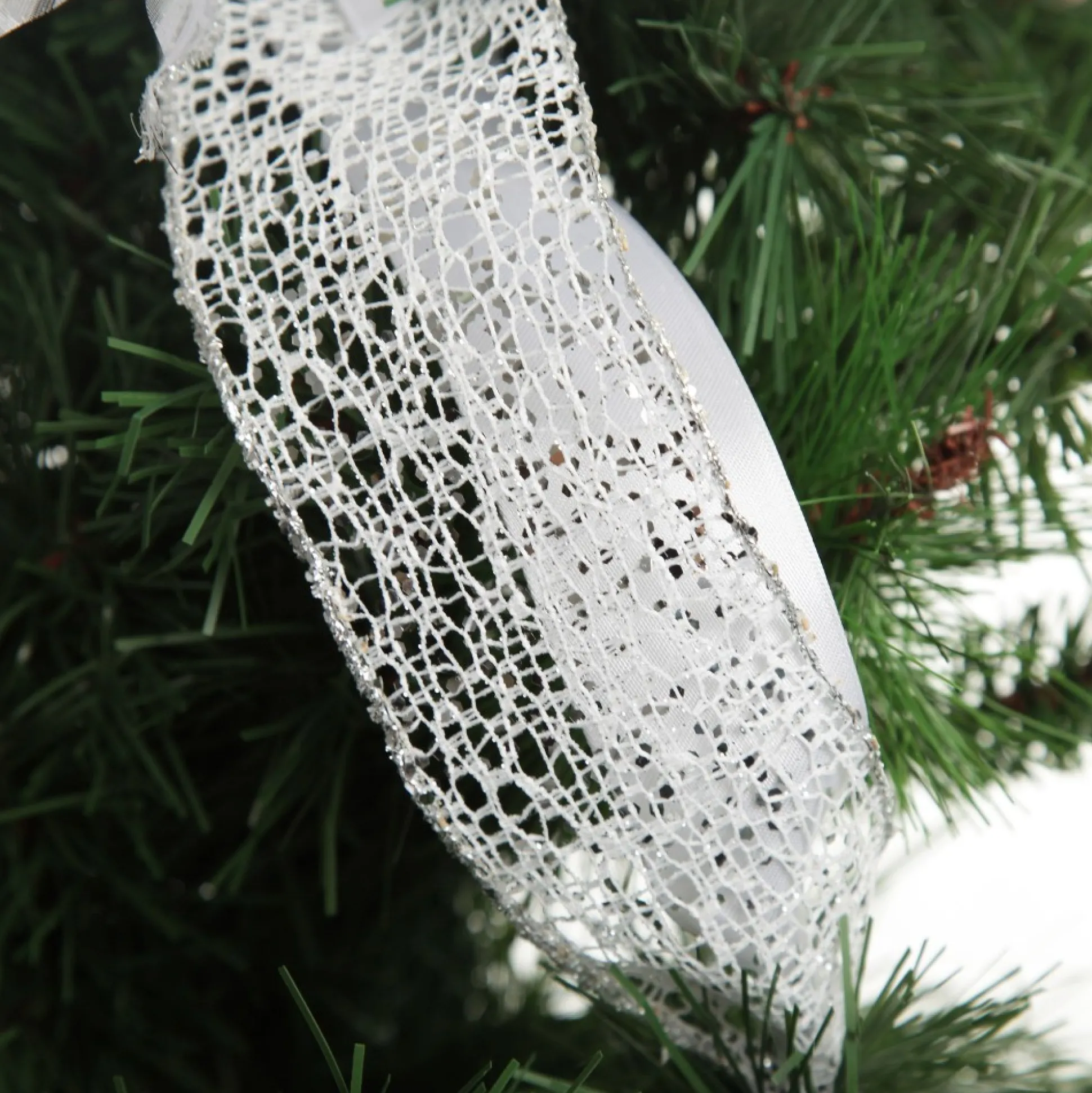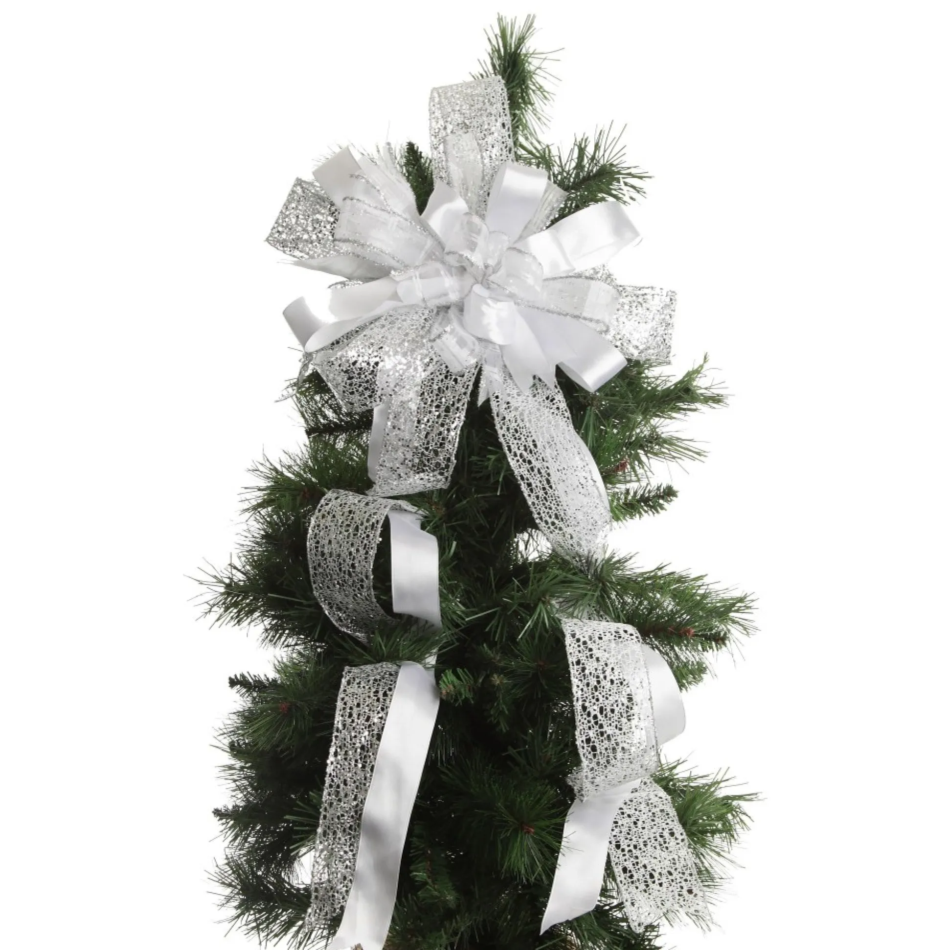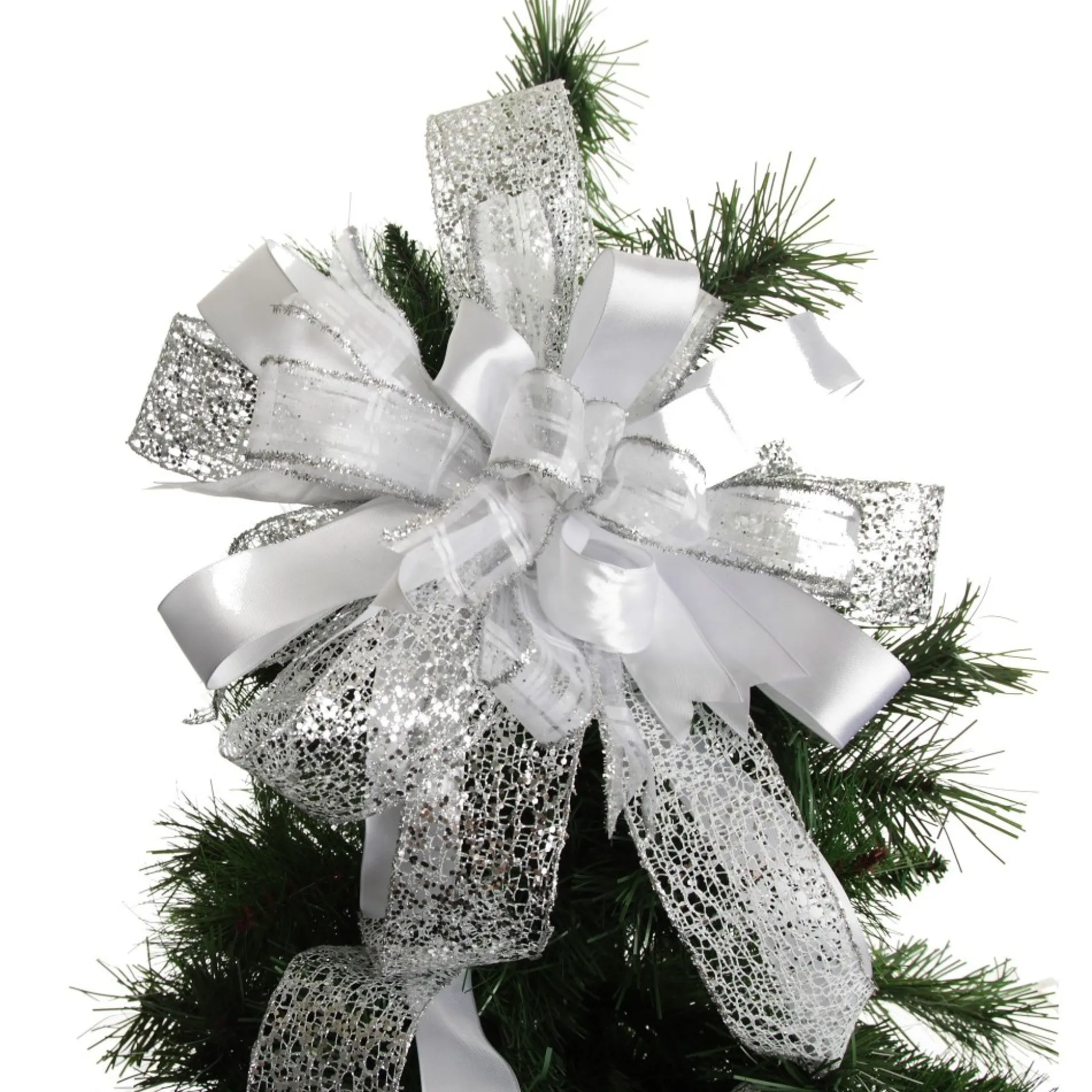 Add Elegance To Your Festive Display With Our White And Silver Glitter Deluxe Tree Topper Bow With Streamers. Featuring A Combination Of 3 Ribbons – Silver Glitter Mesh, White Satin, And Sheer White Plaid With Silver Trim – Hand Crafted Into Intricate Layered Loops Creating A Lush Arrangement. Ribbon ‘streamers’ Hang Down For Added Texture. You Can Use This Unique Bow To Embellish Your Christmas Tree As A Tree Topper, To Decorate A Large Custom Wreath, Or To Decorate Any Door, Wall, Or Window In Your Home. Each Ribbon Is Wired Making It Easy To Place And Arrange When Decorating. Please Note That The Bow Will Arrive Slightly ‘squished’ For Packaging And Shipping Purposes However Due To The Wired Nature Of The Ribbon It Is Easy To Reshape When Decorating.