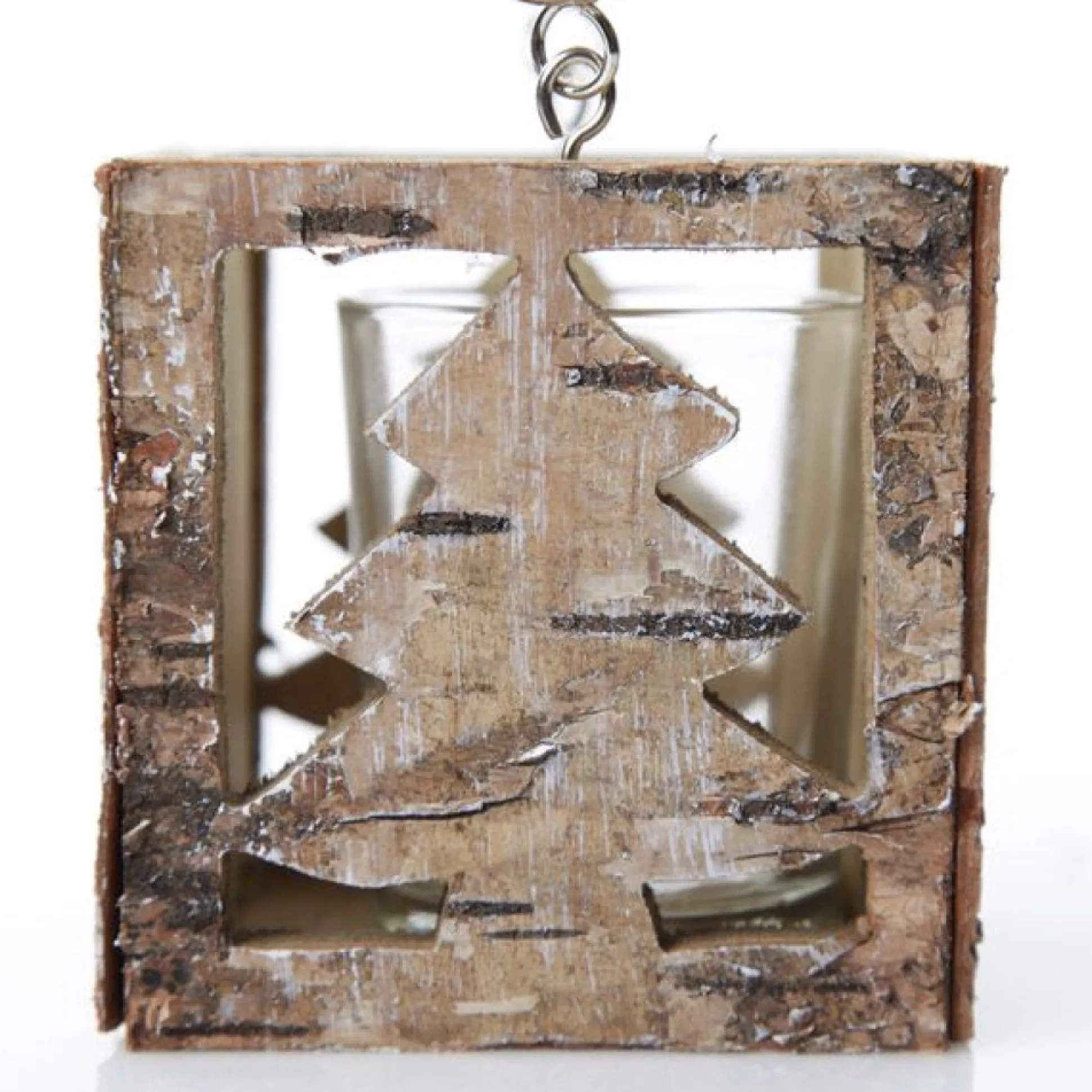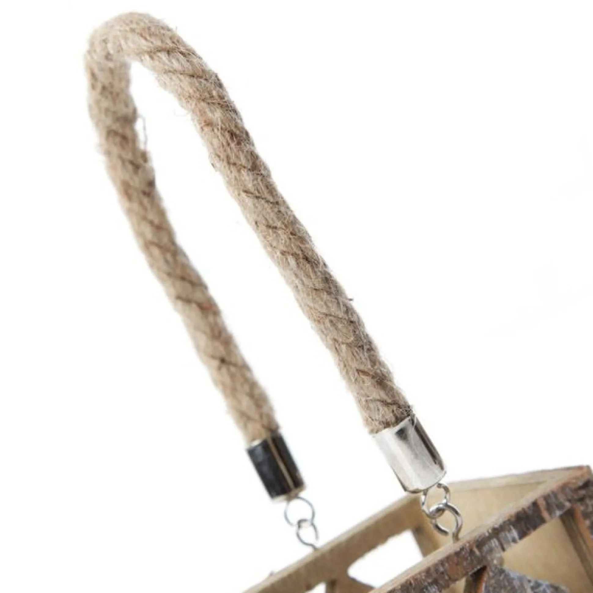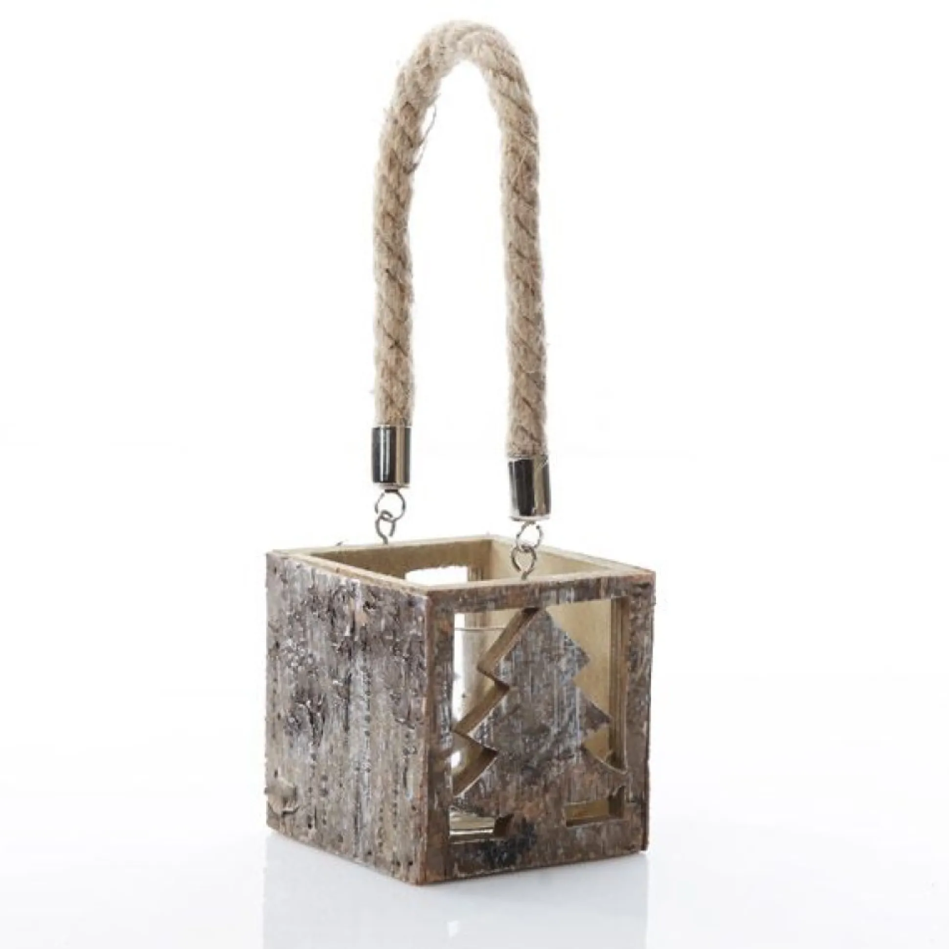 A Beautiful Wooden Votive Box Holder Featuring A Tree Cutout And Easy To Hold Rope Handle.